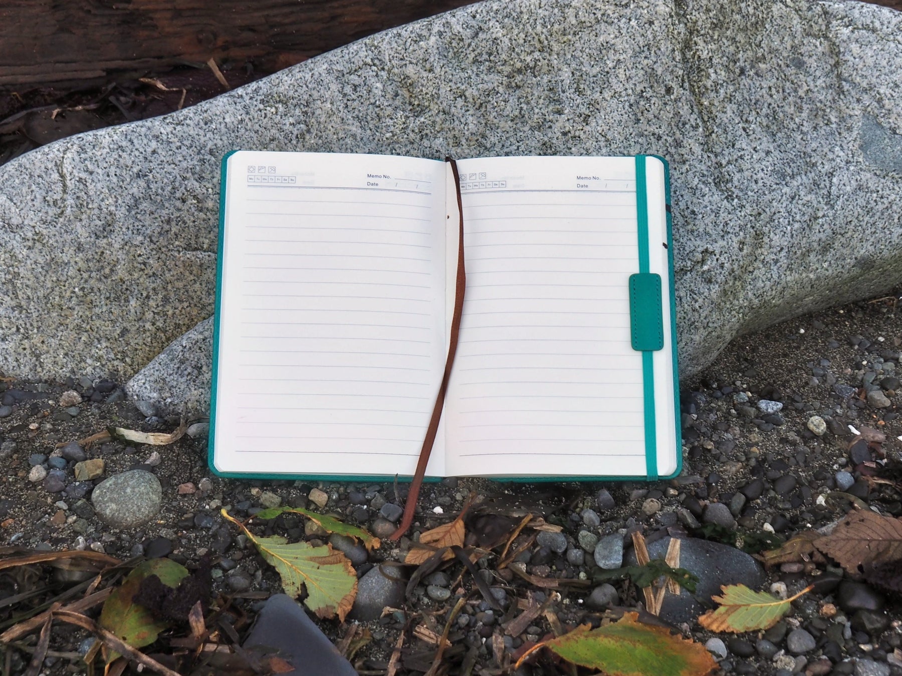 Open notebook on a rock with natural background